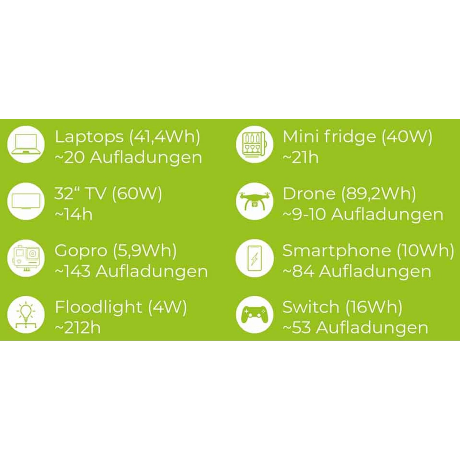 Beachte bitte: Der tatsächliche Stromverbrauch variiert je nach Nutzungsbedingunen. Bei Fragen wende Dich bitte an Jackery Kundenservice für bessere Kaufentscheidung.