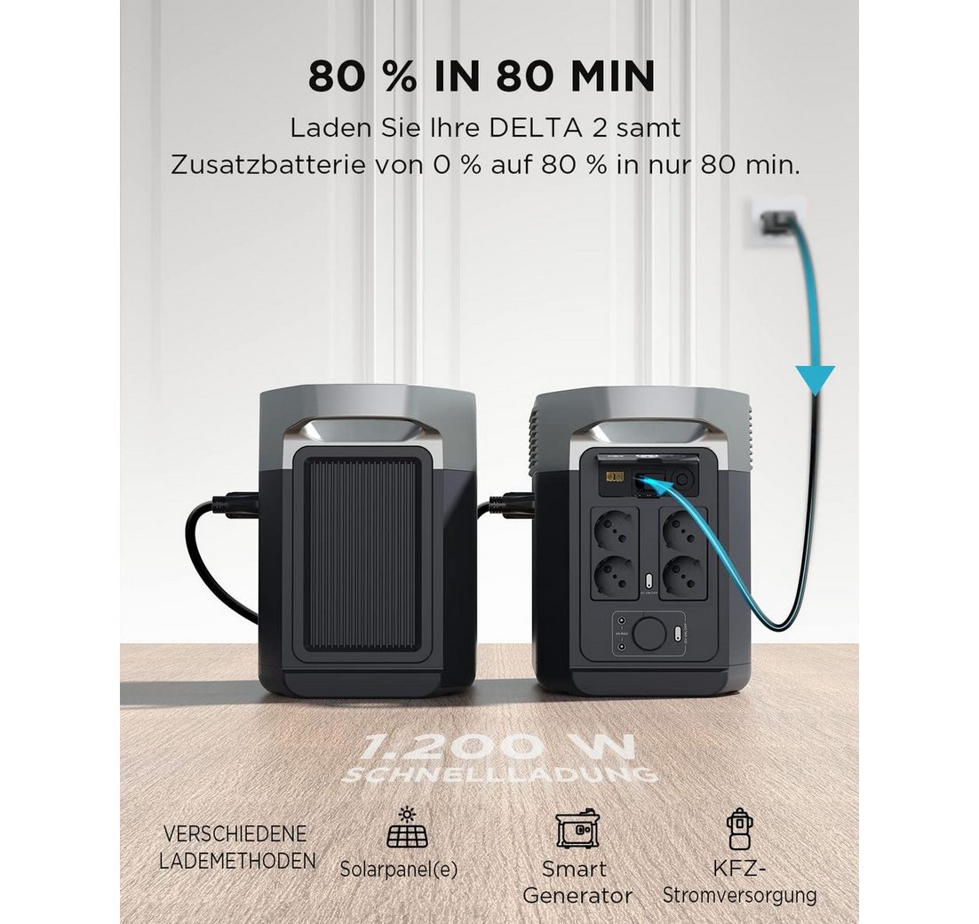 Ecoflow EcoFlow DELTA 2 Tragbare Powerstation 1024Wh, erweiterbar bis 3kWh Powerstation Solar Generator LiFePO4-Batterie DELTA 2 20000 mAh (51,2 V), Schnellladung von 0-80% in 50 Mins, Stromaggregat für Camping/Zuhause