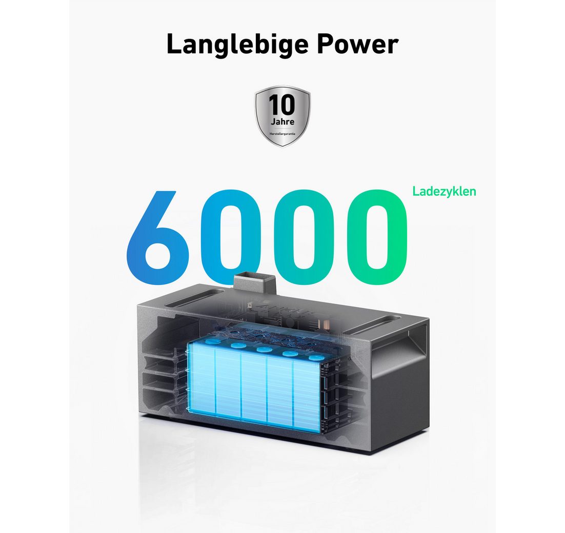 Unsere fortschrittlichen LiFePO4-Akkus bestehen aus Zellen mit quadratischem Gehäuse, die bis zu 6000 Zyklen unterstützen. Nach 6000 Zyklen bleibt die Batteriekapazität bei 70%.