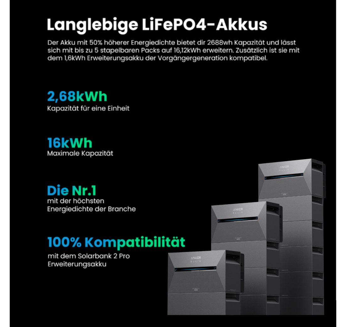 Der Akku mit 50% höherer Energiedichte bietet dir 2.688kWh Kapazität und lässt sich mit bis zu 5 stapelbaren Packs auf 16,128 kWh erweitern. Zusätzlich ist sie mit dem 1,6kWh Erweiterungsakku der Vorgängergeneration kompatibel.