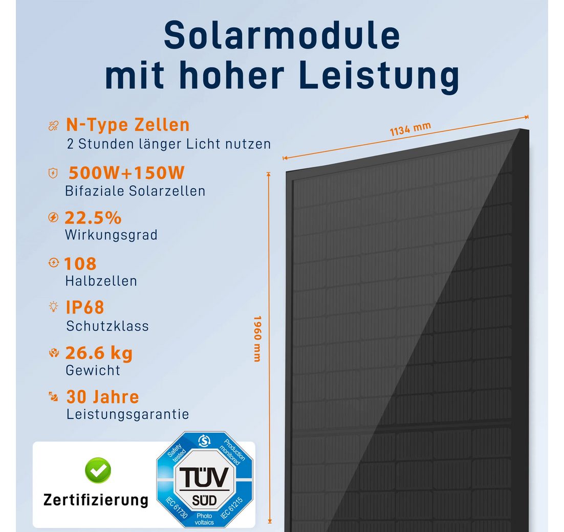 Die Bauer Solarmodule (450 Wp) werden in Deutschland entwickelt und überzeugen durch modernste N-Type Zelltechnologie mit bifazialem Aufbau. Die Module nutzen Sonnenlicht auf Vorder- und Rückseite und ermöglichen so je nach Installationsumgebung bis zu 30 % Mehrertrag. Der hochwertige Glas-Glas-Aufbau mit gehärtetem Antireflexionsglas vorne und hinten sorgt für maximale Widerstandsfähigkeit gegenüber Umwelteinflüssen. Dank Brandschutzklasse A, einem geprüften Hagelwiderstand bis 30 mm Korndurchmesser und der hohen Temperaturbeständigkeit von -40 bis +85 °C sind die Module auch unter extremen Bedingungen besonders langlebig. Profitiere von höchster Qualität mit 30 Jahren Produkt- und Leistungsgarantie.