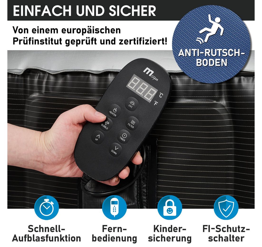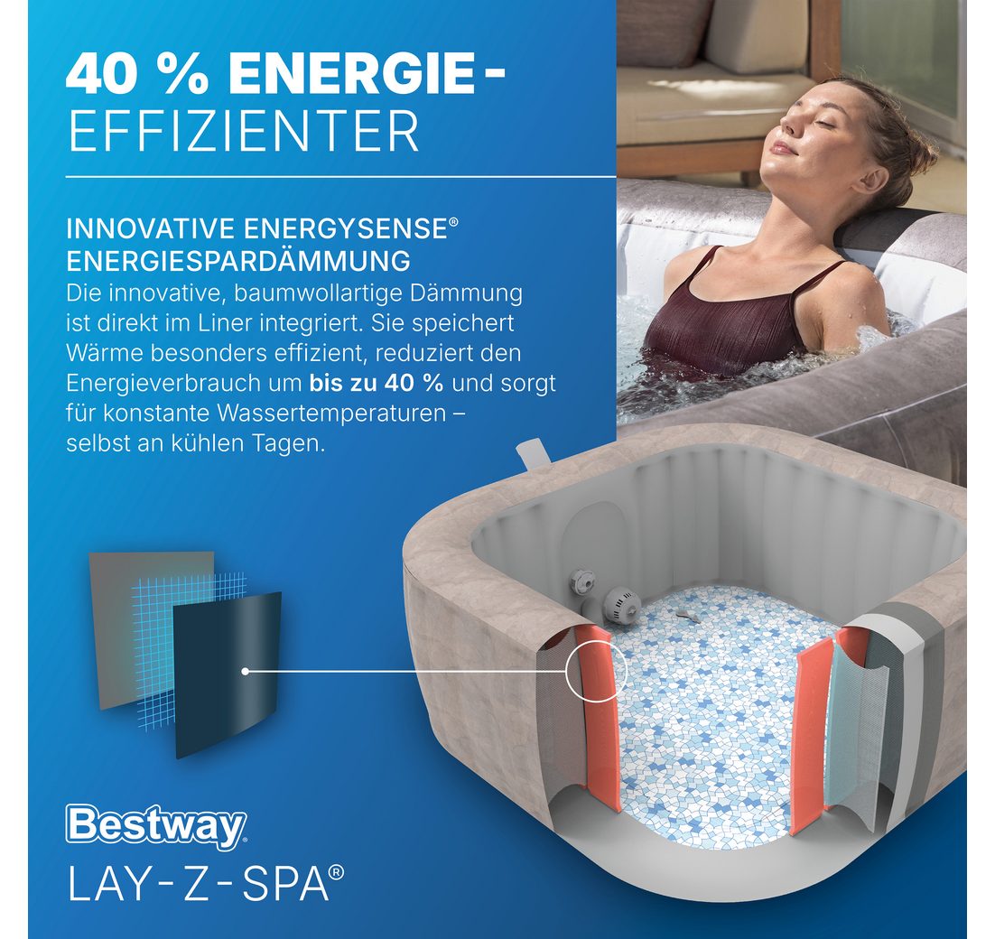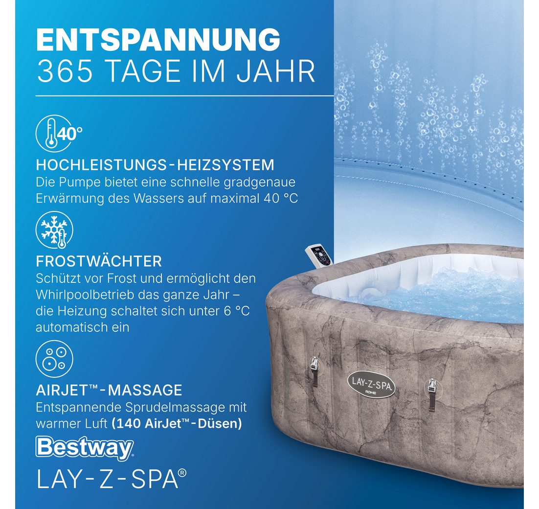 - Effektive Massage: Über 110 Luftdüsen bieten eine aufregende Sprudelmassage im 40°C warmen Wasser.