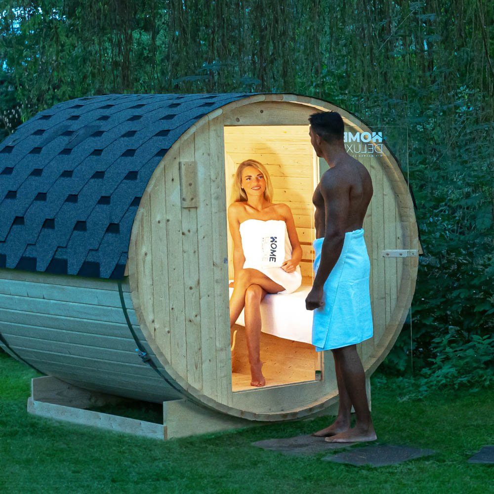 XXL Luxus Outdoor Fasssauna 191×220 cm SET Sauna inkl. 8 KW Saunaofen 4 Pers.
